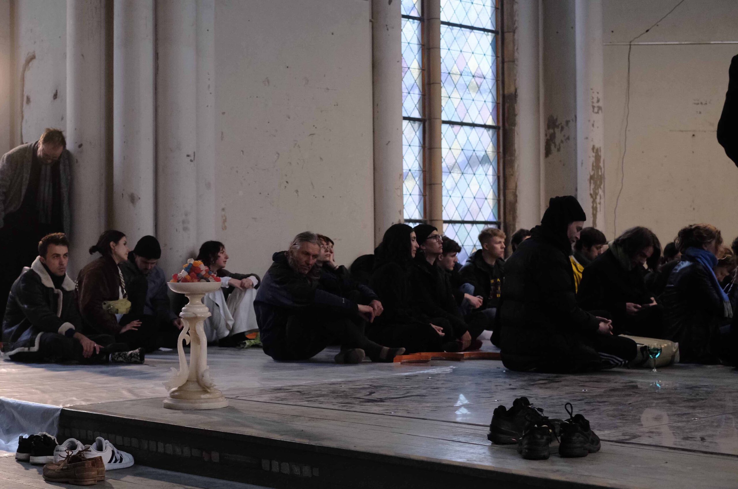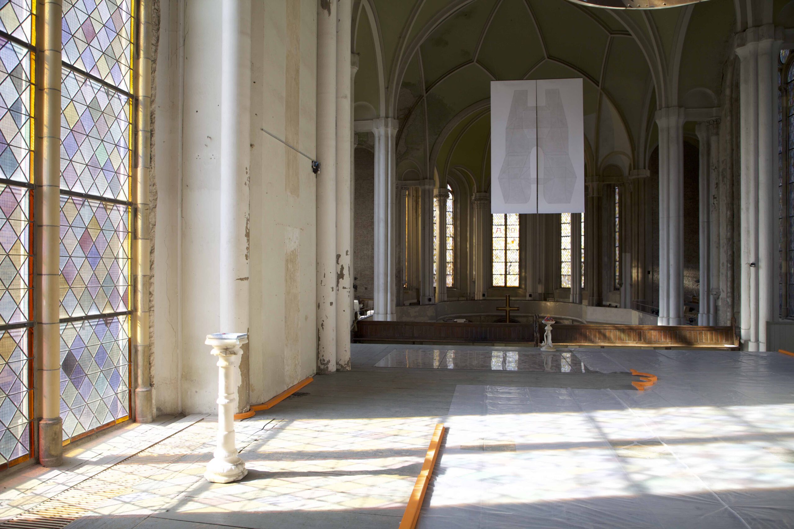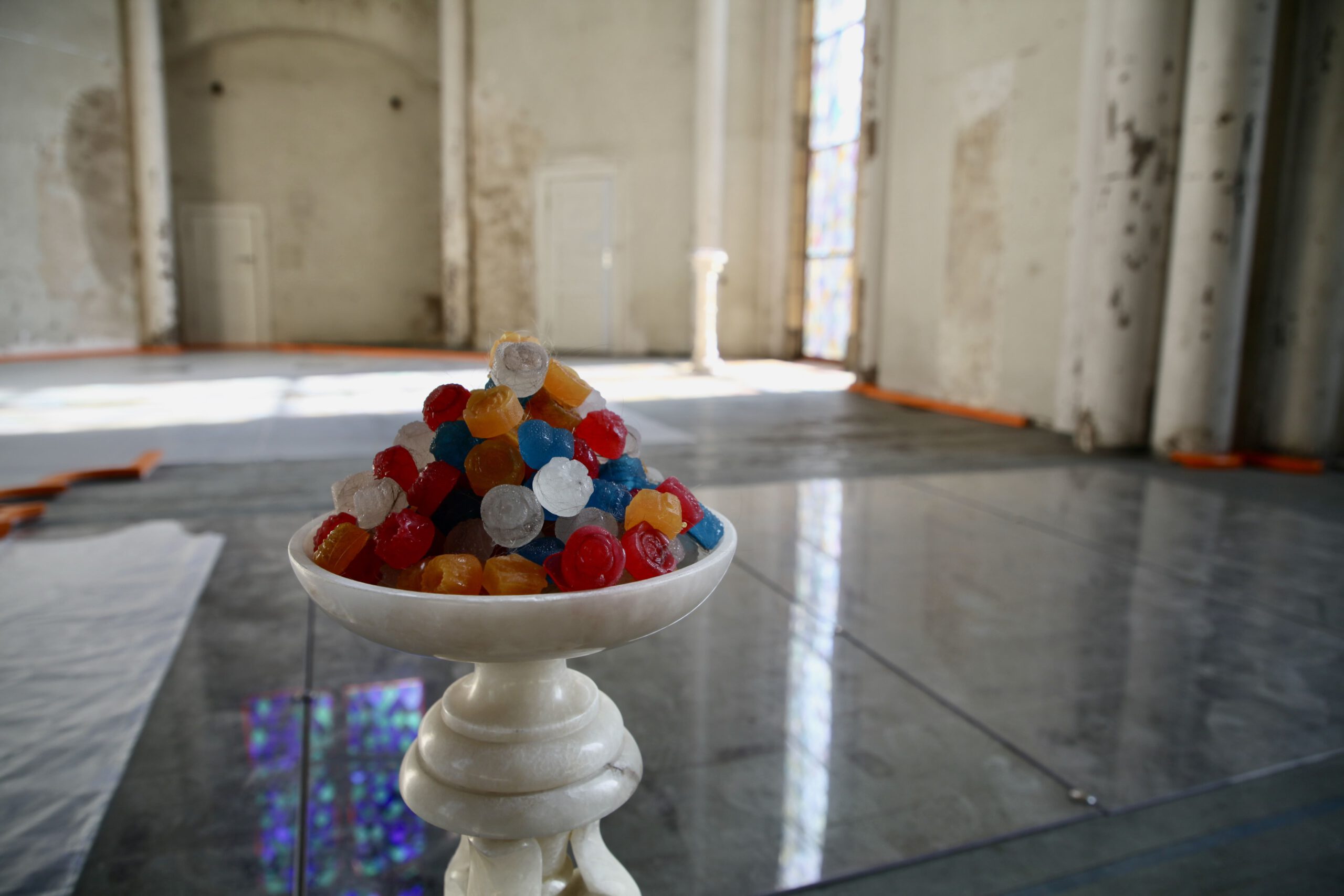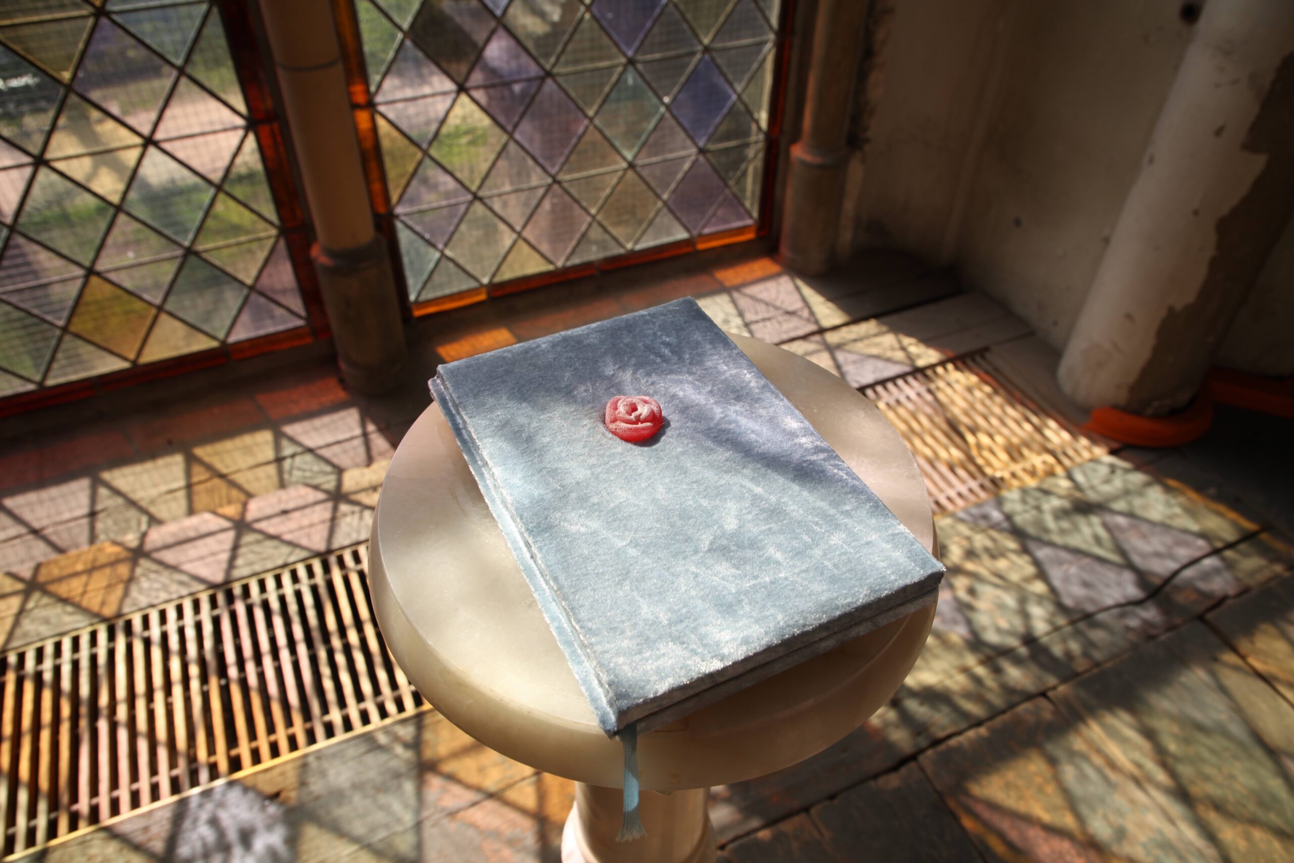Séverine oder wie ein König stürzt (2023) book, sugar, hair, aroma, columns, exhibition view Zionskirche, Berlin